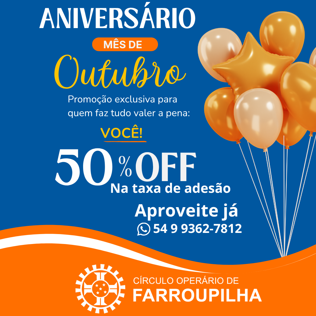 🎉Outubro é mês de festa no Círculo Operário de Farroupilha!Mais do que uma adesão — uma experiência de vantagens! ✨ ✨ 👉 50% OFF na taxa de adesãoÉ a oportunidade perfeita para fazer parte de um espaço que valoriza cuidado, acolhimento e qualidade de vida.